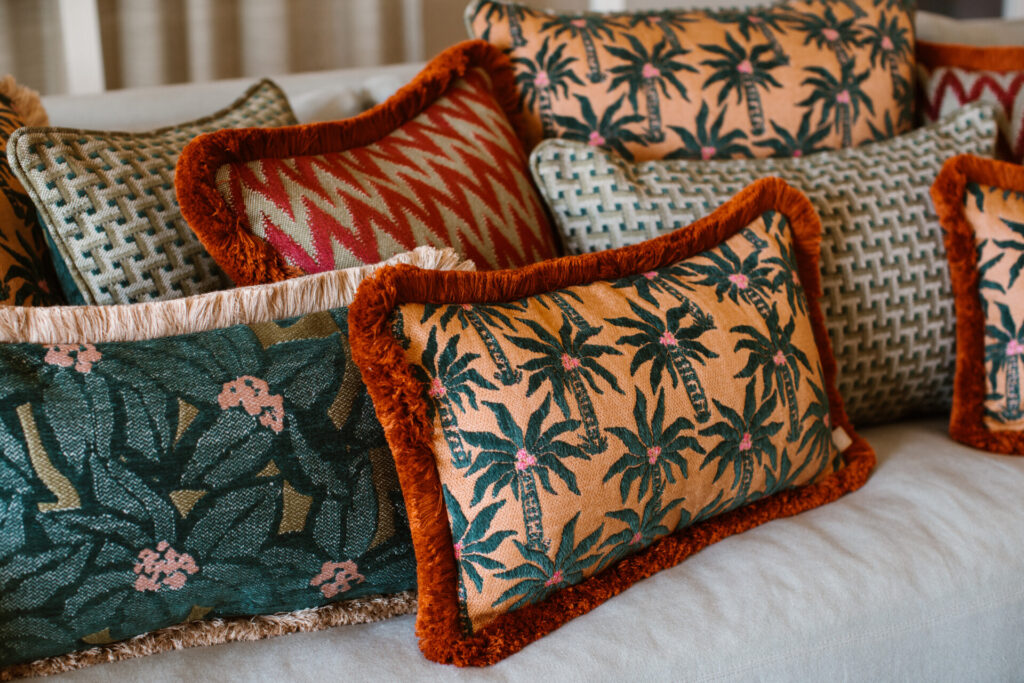 De setting wordt verfijnd aangekleed met de luxueuze indoor en outdoor kussens van Palais, die extra comfort en een speelse toets toevoegen.