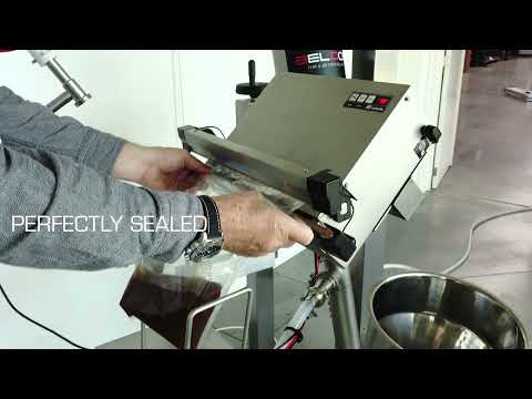 Geautomatiseerde vulmachine in combinatie met sluitmachine voor plastic petzakken, bekers of bakjes.
